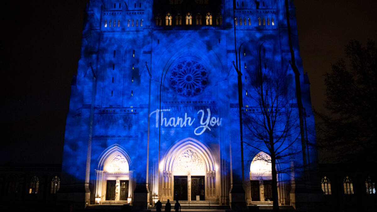 (Photo Credit; In honor and support of healthcare and medical professionals, the Washington National Cathedral is lit up blue with a thank message on Friday, April 17, 2020. (Photo by Caroline Brehman/CQ-Roll Call, Inc via Getty Images)