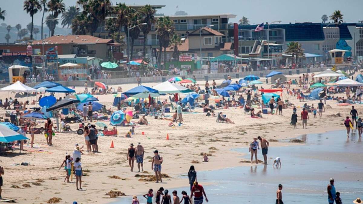 (Photo credit Getty Images) / Beachgoers along Pacific Beach on July 4, 2020.)