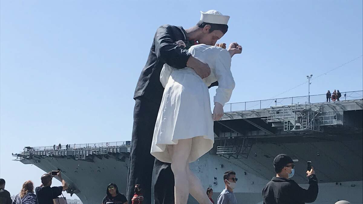 (Photo C E. Albert) San Diego’s eye-catching statue replicating the iconic World War II-era photograph of a lip-locked sailor and a nurse is something everyone knows. Known as “Embracing Peace” located next to the USS Midway.