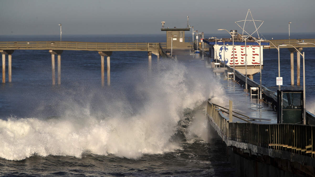 In this January 11, 2021 photo, large waves hit the Ocean Beach Pier causing minor damage. (Photo by Sean M. Haffey/Getty Images)Photo: Getty Images